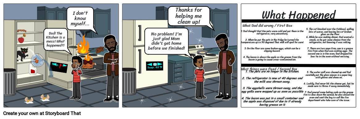 5. The cat knocked over the fishbowl, spilling lots of water, and leaving lots of broken glass on the floor 6. While he was making dinner, Dad wanted a snack, so he got some cheese from the refrigerator, not knowing it was rotting.7. There are two open fires, one is a grease fire from when Dad was cooking eggs. The second one is in the oven, Dad dropped his bow tie in the oven without noticing.