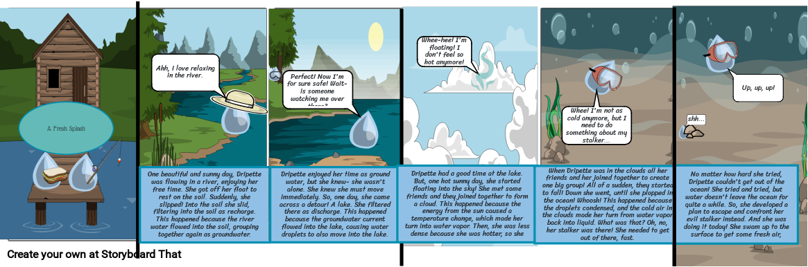 When Dripette was in the clouds all her friends and her joined together to create one big group! All of a sudden, they started to fall! Down she went, until she plopped in the ocean! Whoosh! This happened because the droplets condensed, and the cold air in the clouds made her turn from water vapor back into liquid. What was that? Oh, no, her stalker was there! She needed to get out of there, fast.