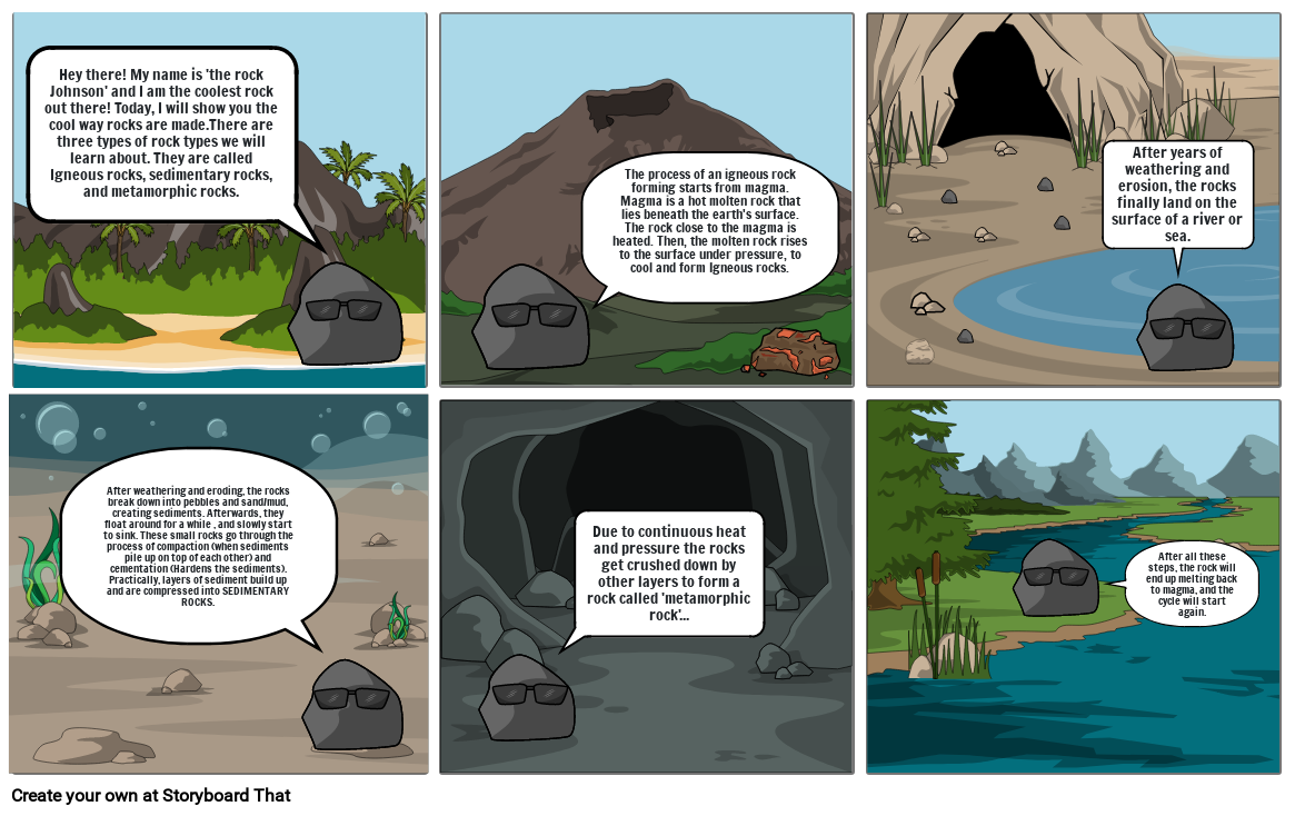 Hey there! My name is 'the rock Johnson' and I am the coolest rock out there! Today, I will show you the cool way rocks are made.There are three types of rock types we will learn about. They are called Igneous rocks, sedimentary rocks, and metamorphic rocks.