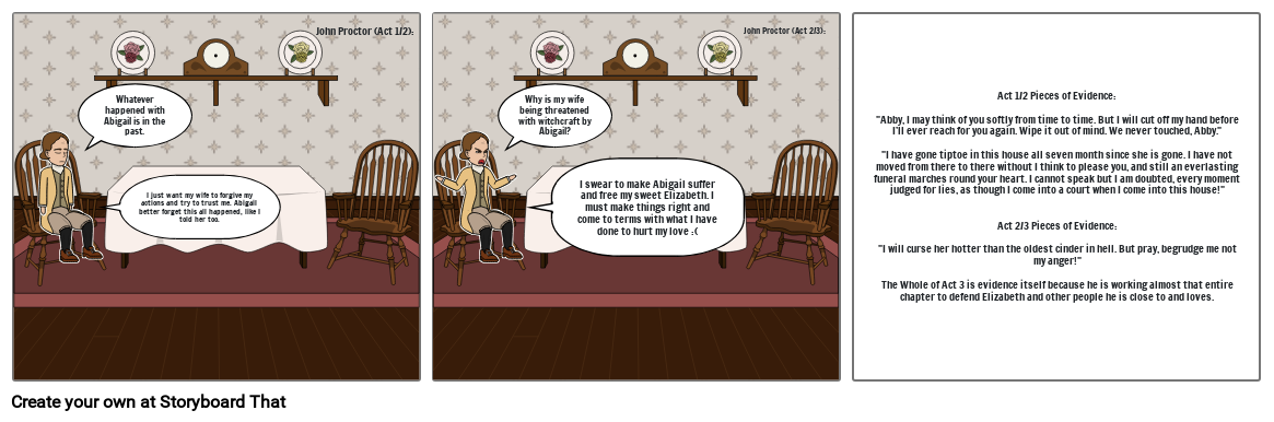 Act 1/2 Pieces of Evidence:"Abby, I may think of you softly from time to time. But I will cut off my hand before I’ll ever reach for you again. Wipe it out of mind. We never touched, Abby.""I have gone tiptoe in this house all seven month since she is gone. I have not moved from there to there without I think to please you, and still an everlasting funeral marches round your heart. I cannot speak but I am doubted, every moment judged for lies, as though I come into a court when I come into this house!"Act 2/3 Pieces of Evidence:"I will curse her hotter than the oldest cinder in hell. But pray, begrudge me not my anger!"The Whole of Act 3 is evidence itself because he is working almost that entire chapter to defend Elizabeth and other people he is close to and loves.