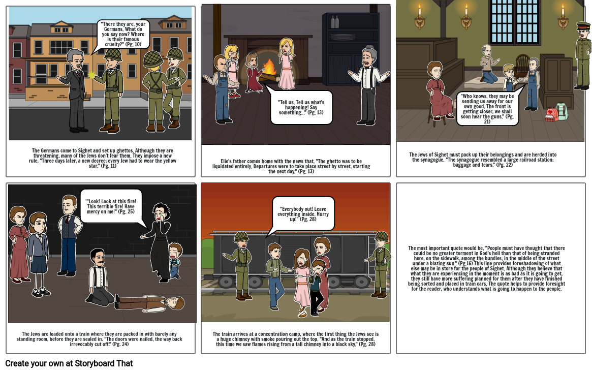 The Germans come to Sighet and set up ghettos. Although they are threatening, many of the Jews don't fear them. They impose a new rule, "Three days later, a new decree: every Jew had to wear the yellow star." (Pg. 11)