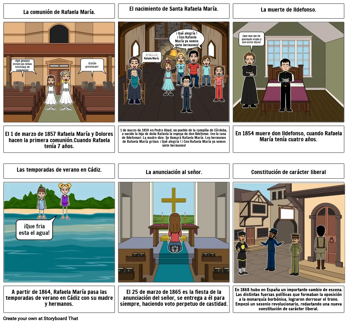 1 de marzo de 1850 en Pedro Abad, un pueblo de la campiña de Córdoba, a nacido la hija de doña Rafaela la esposa de don Ildefonso. (en la casa de Ildefonso): La madre dice: Se llamará Rafaela María. Los hermanos de Rafaela María gritan: ¡ Qué alegría ! ¡ Con Rafaela María ya somos siete hermanos!