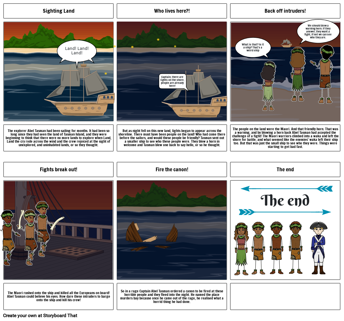The Maori rushed onto the ship and killed all the Europeans on board! Abel Tasman could believe his eyes. How dare these intruders to barge onto the ship and kill his crew!