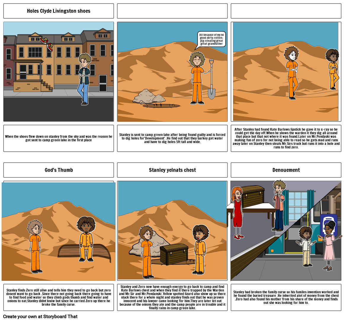 Stanley and Zero now have enough energy to go back to camp and find Kate Barlows chest and when they find it there trapped by the Warden and Mr.Sir and Mr.Pendanski .Yellow spotted lizard also show up so there stuck there for a whole night and stanley finds out that he was proven innocent and his lawyer came looking for him.They are later let out because of the onions they ate and the camp people are in trouble and it finally rains in camp green lake.