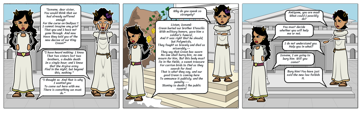 Listen, Ismenê:Creon buried our brother Eteoclês With military honors, gave him a soldier’s funeral,And it was right that he should; but Polyneicês,They fought as bravely and died as miserably,--They say that Creon has swornNo one shall burry him, no one mourn for him, But this body must lie in the fields, a sweet treasureFor carrion birds to find as they search for food.That is what they say, and our good Creon is coming hereTo announce it publicly; and the penalty ––Stoning to death I the public squarel
