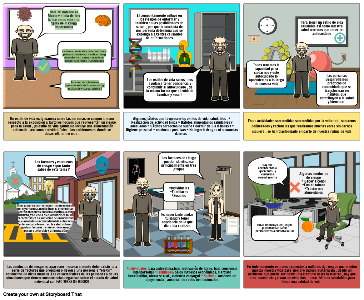 En todo momento estamos expuestos a millones de riesgos que pueden marcar nuestra vida para siempre incluso quitárnosla , desde un accidente que pueda ser desde una fractura hasta la muerte , hay que tener conciencia y tratar de evitarlos , tomar hábitos saludables para llevar una calidad de vida .