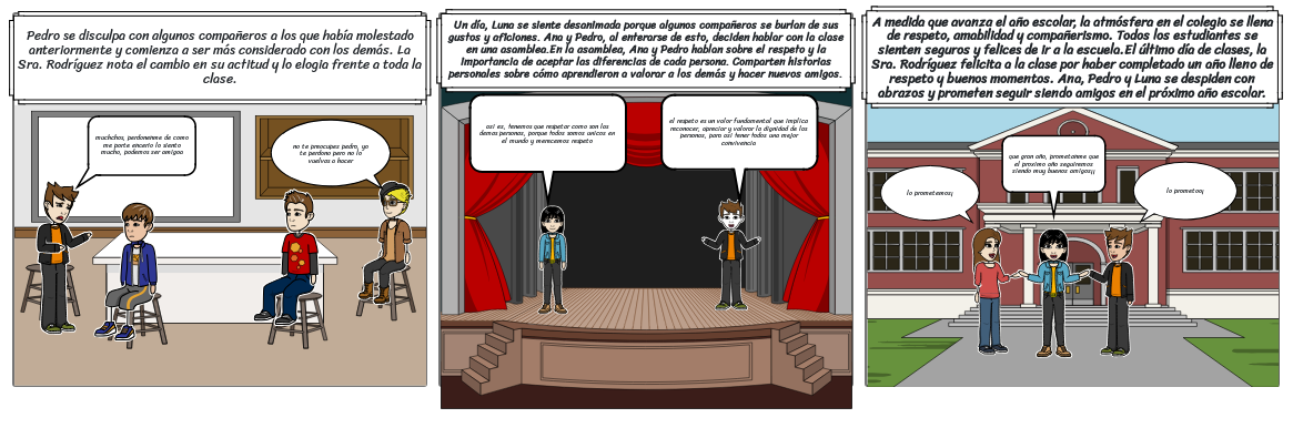 A medida que avanza el año escolar, la atmósfera en el colegio se llena de respeto, amabilidad y compañerismo. Todos los estudiantes se sienten seguros y felices de ir a la escuela.El último día de clases, la Sra. Rodríguez felicita a la clase por haber completado un año lleno de respeto y buenos momentos. Ana, Pedro y Luna se despiden con abrazos y prometen seguir siendo amigos en el próximo año escolar.