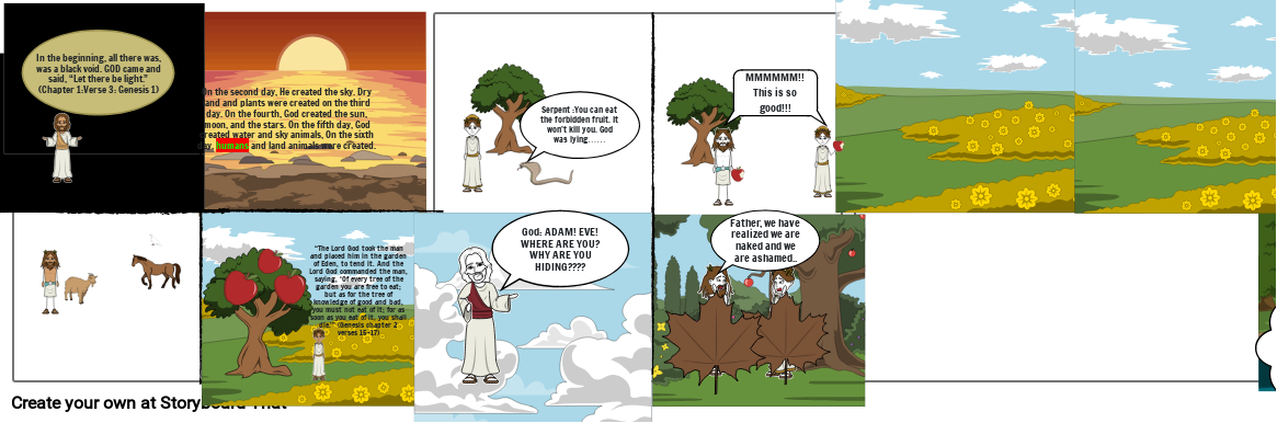 God made a garden. The garden of Eden, god instructs Adam to not eat the fruit from the forbidden tree. God gives Adam the woman Eve so they can work against temptation