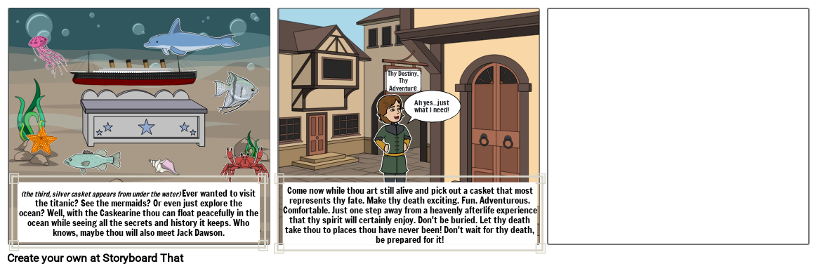 (the third, silver casket appears from under the water) Ever wanted to visit the titanic? See the mermaids? Or even just explore the ocean? Well, with the Caskearine thou can float peacefully in the ocean while seeing all the secrets and history it keeps. Who knows, maybe thou will also meet Jack Dawson.