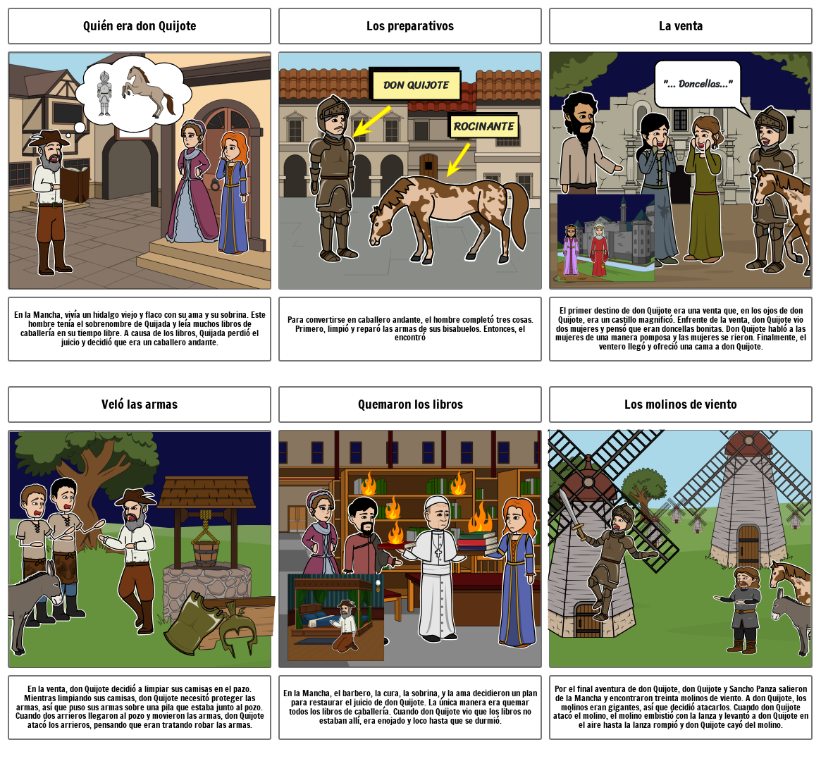 Por el final aventura de don Quijote, don Quijote y Sancho Panza salieron de la Mancha y encontraron treinta molinos de viento. A don Quijote, los molinos eran gigantes, así que decidió atacarlos. Cuando don Quijote atacó el molino, el molino embistió con la lanza y levantó a don Quijote en el aire hasta la lanza rompió y don Quijote cayó del molino.