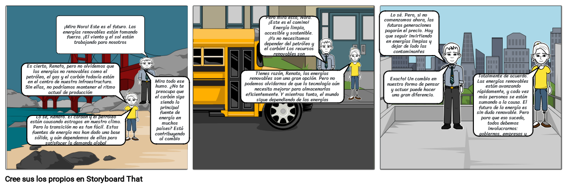 Pero mira esto, Nora. ¡Este es el camino! Energía limpia, accesible y sostenible. ¡Ya no necesitamos depender del petróleo y el carbón! Los recursos renovables son inagotables