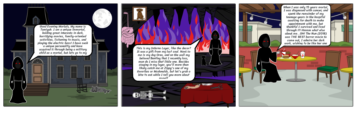 Good Evening Mortals, My name is Tamiyah. I am a unique immortal, holding great interests in dark, horrifying movies, family-oriented activities, lisitening to music, and playing the electric bass! I have such a unique personality and have acquired it through being a military child as a mortal, but lets go to my room to learn more about me!