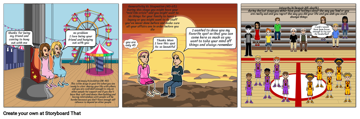 Generativity Vs Stagnation (40-65)During this stage you might have your "mid life crisis" and you might want to do things for your family to leave a legacy or you might want to do stuff you've never done before and make sure all your affairs are in order before you die