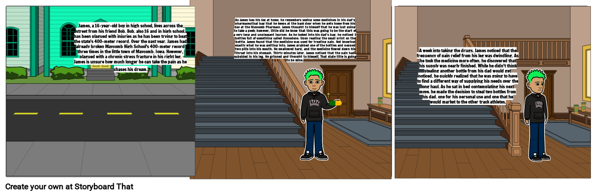As James ices his leg at home, he remembers seeing some medicines in his dad’s pharmaceutical bag that he keeps at the back door when he gets home from his day at the Maycomb Pharmacy. James thought to himself that he was just going to take a peek; however, little did he know that this was going to be the start of a very long and unpleasant journey. As he looked into his dad’s bag, he noticed 3 bottles full of something called Oxycodone. Upon reading the small print on the bottle, James found that the medicine was used for treating pain. Not knowing exactly what he was getting into, James grabbed one of the bottles and popped two pills into his mouth. He swallowed hard, and the medicine flowed down his throat into his stomach. Thirty minutes later, James noticed that the pain had subsided in his leg. He grinned and thought to himself, That state title is going to be mine.