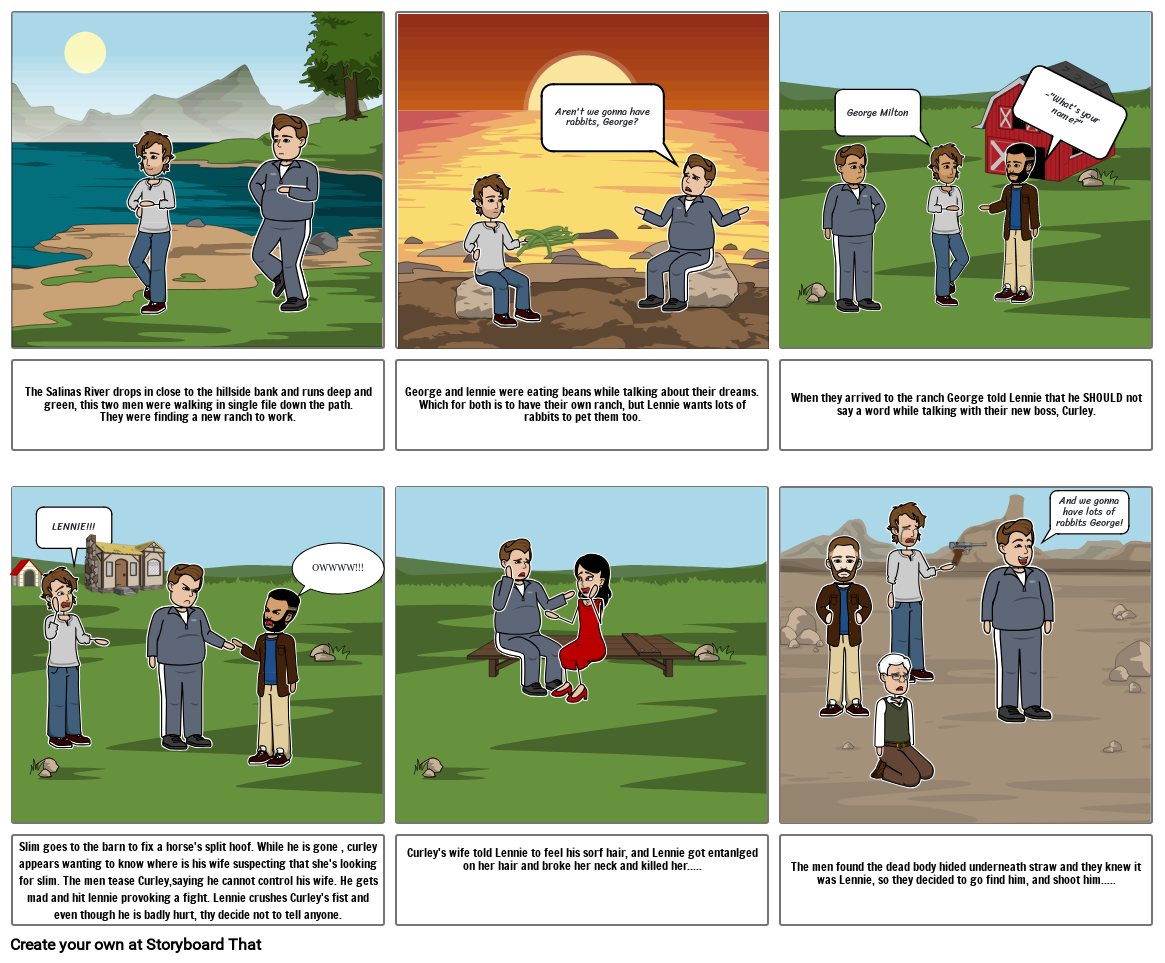 Slim goes to the barn to fix a horse's split hoof. While he is gone , curley appears wanting to know where is his wife suspecting that she's looking for slim. The men tease Curley,saying he cannot control his wife. He gets mad and hit lennie provoking a fight. Lennie crushes Curley's fist and even though he is badly hurt, thy decide not to tell anyone.
