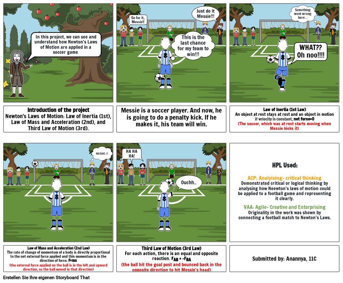 HPL Used:ACP: Analyising- critical thinkingDemonstrated critical or logical thinking by analysing how Neewton's laws of motion could be applied to a football game and representing it clearly. VAA: Agile- Creative and EnterprisingOriginality in the work was shown by connecting a football match to Newton's Laws.