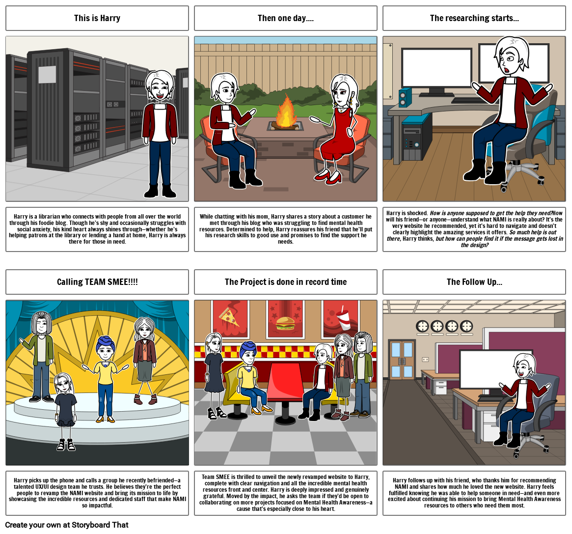 Harry is shocked. How is anyone supposed to get the help they need?How will his friend—or anyone—understand what NAMI is really about? It’s the very website he recommended, yet it’s hard to navigate and doesn’t clearly highlight the amazing services it offers. So much help is out there, Harry thinks, but how can people find it if the message gets lost in the design?