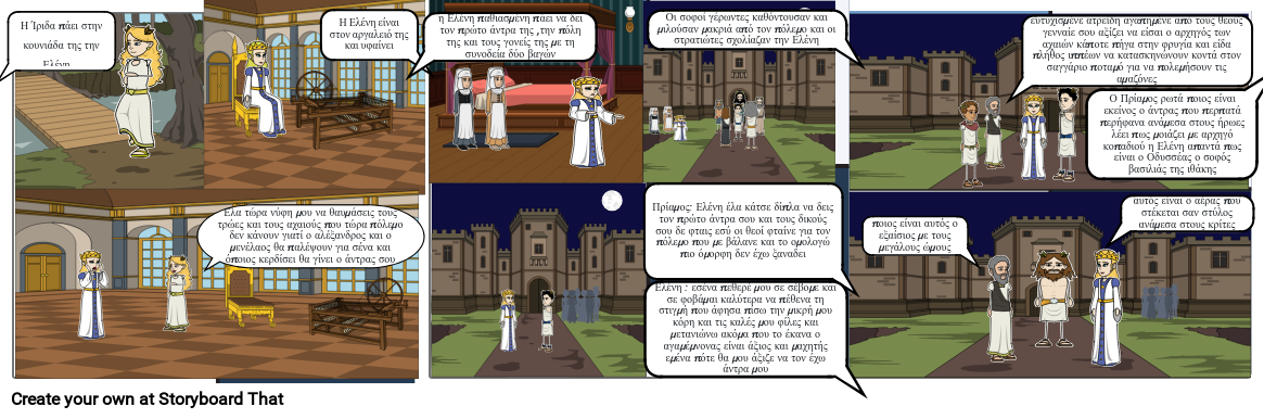 Ελένη : εσένα πεθερέ μου σε σέβομε και σε φοβάμαι καλύτερα να πέθενα τη στιγμή που άφησα πίσω την μικρή μου κόρη και τις καλές μου φίλες και μετανιώνω ακόμα που το έκανα ο αγαμέμνονας είναι άξιος και μαχητής εμένα πότε θα μου άξιζε να τον έχω άντρα μου