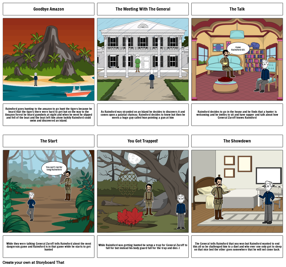 Rainsford goes hunting to the amazon to go hunt the tigers because he heard that the tigers there were hard to get but on the way to the Amazon forest he heard gunshots at night and when he went he slipped and fell of the boat and the boat left him alone luckily Rainsford could swim and discovered an island.