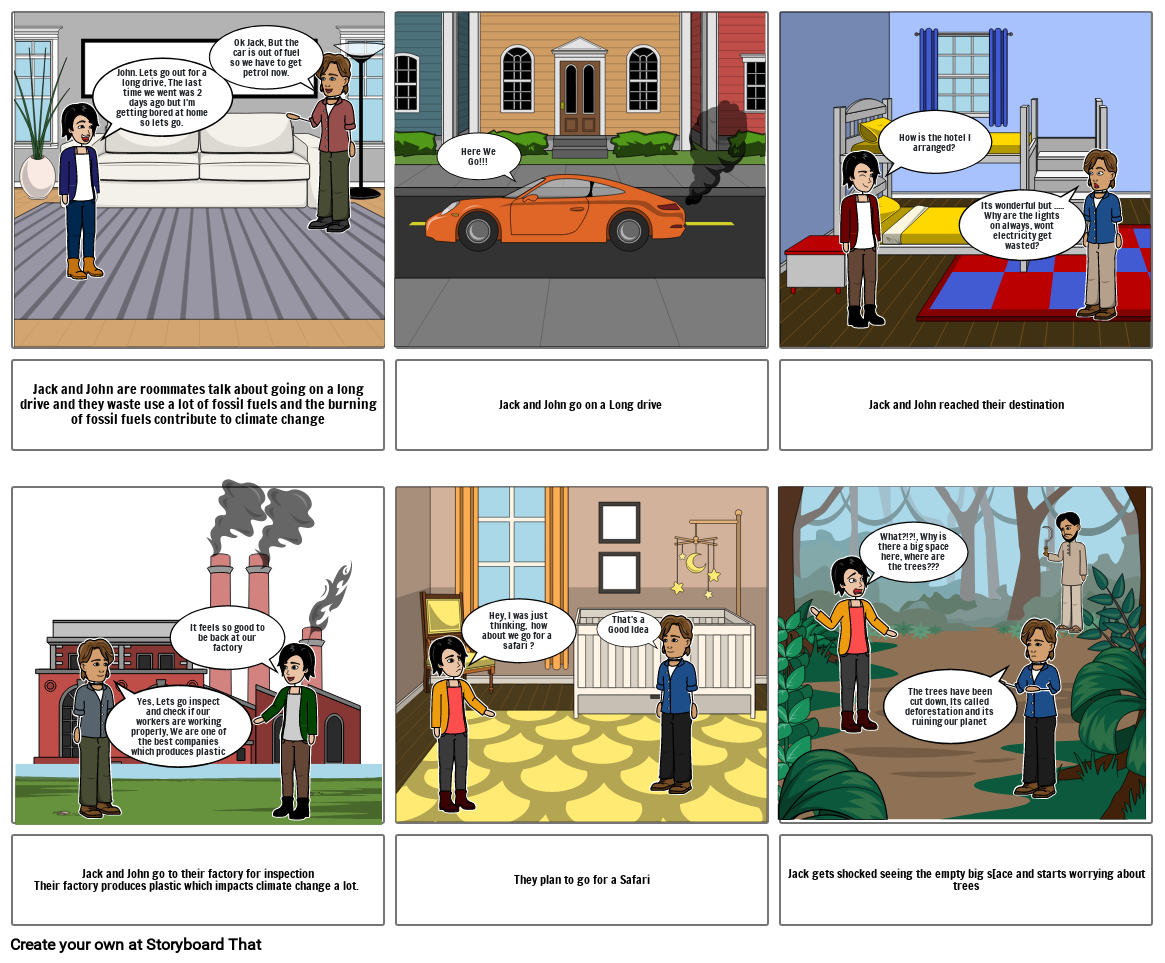 Jack and John are roommates talk about going on a long drive and they waste use a lot of fossil fuels and the burning of fossil fuels contribute to climate change