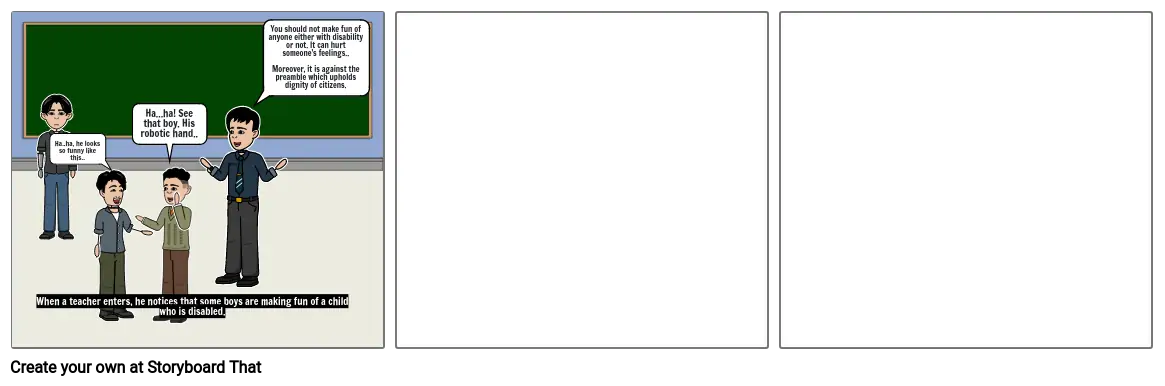 When a teacher enters, he notices that some boys are making fun of a child who is disabled.