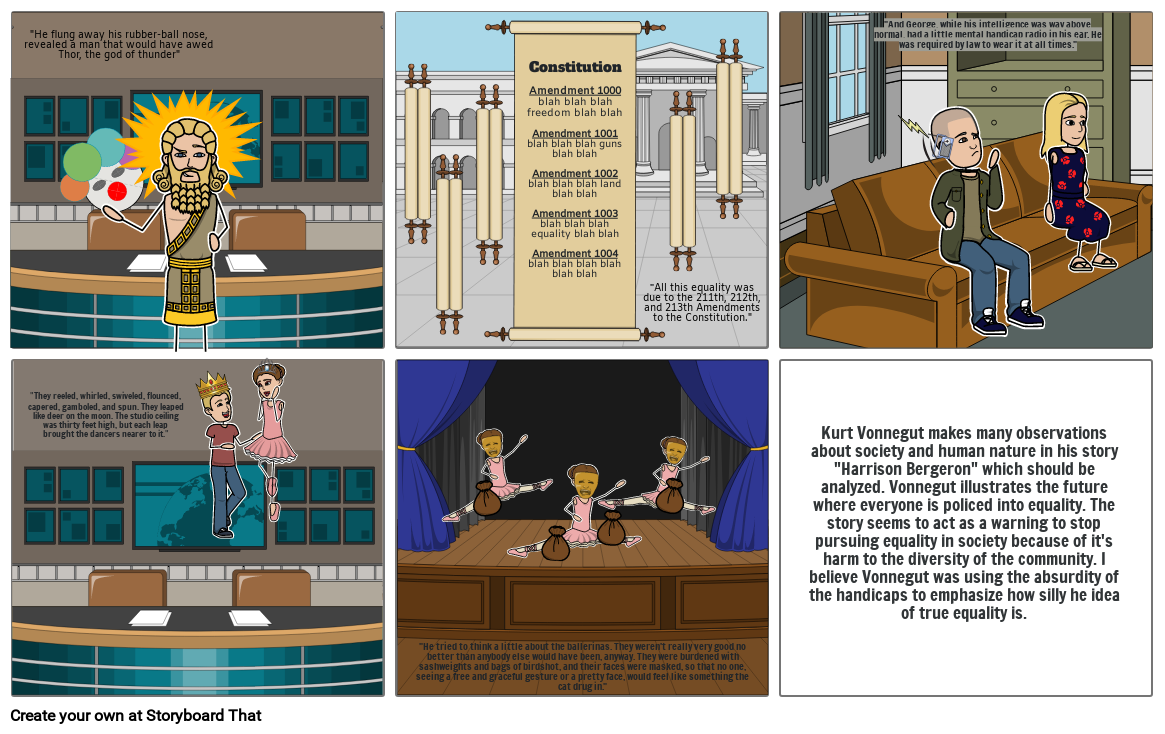 Kurt Vonnegut makes many observations about society and human nature in his story Harrison Bergeron which should be analyzed. Vonnegut illustrates the future where everyone is policed into equality. The story seems to act as a warning to stop pursuing equality in society because of it's harm to the diversity of the community. I believe Vonnegut was using the absurdity of the handicaps to emphasize how silly he idea of true equality is.