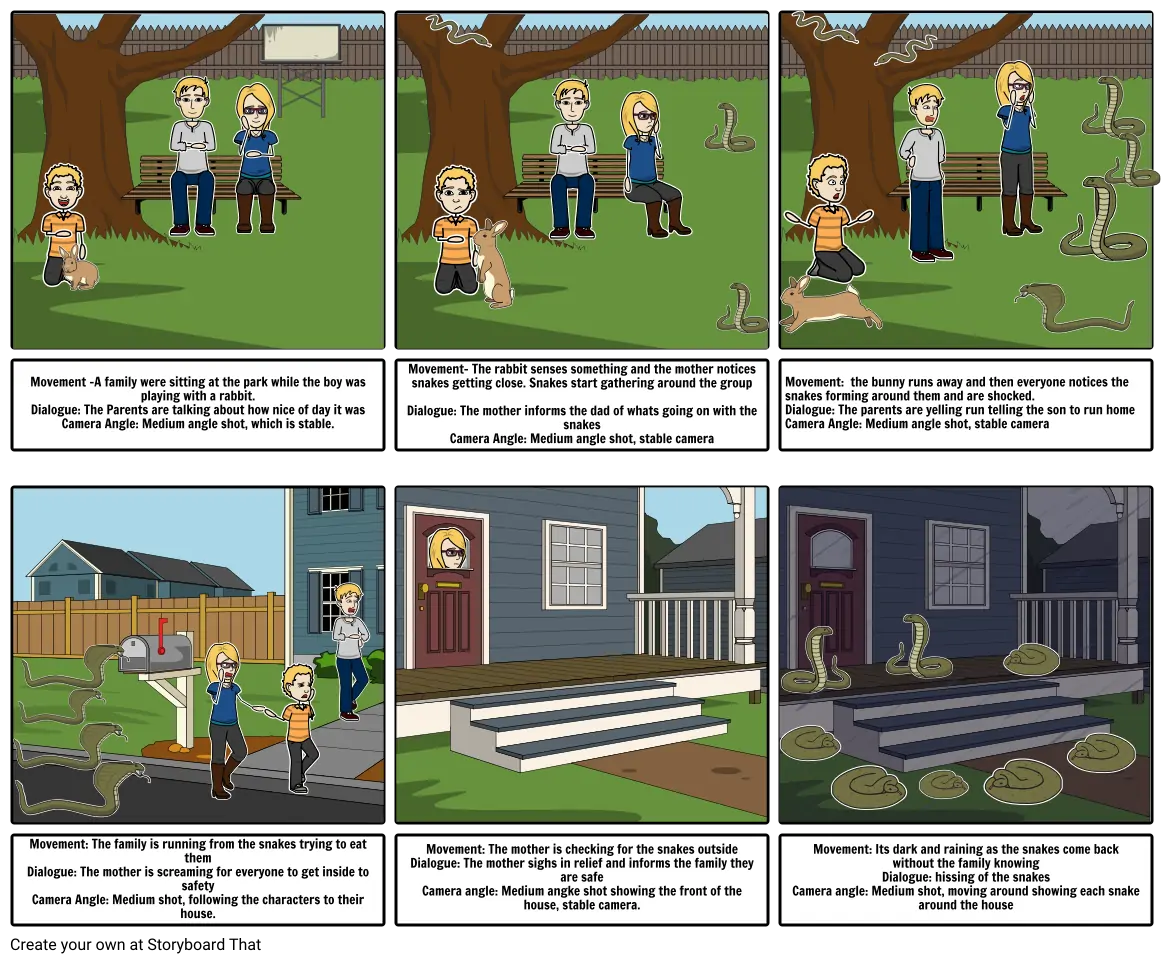 Movement: the bunny runs away and then everyone notices the snakes forming around them and are shocked. Dialogue: The parents are yelling run telling the son to run home Camera Angle: Medium angle shot, stable camera