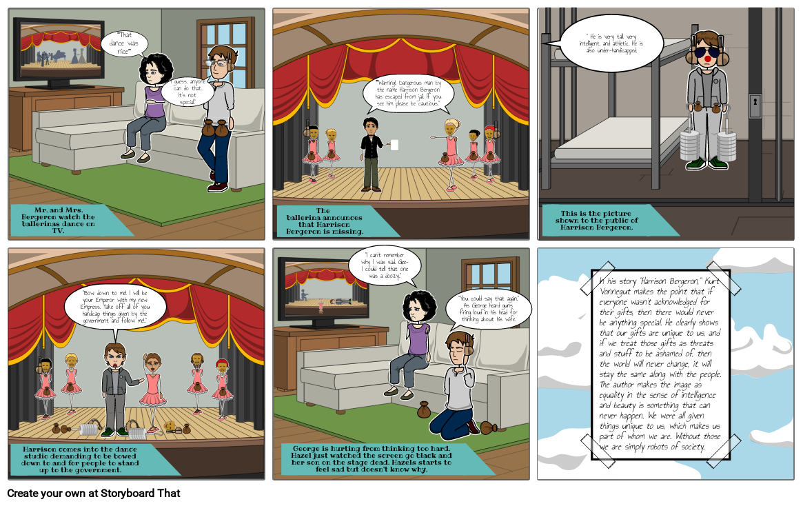 In his story "Harrison Bergeron," Kurt Vonnegut makes the point that if everyone wasn't acknowledged for their gifts, then there would never be anything special. He clearly shows that our gifts are unique to us, and if we treat those gifts as threats and stuff to be ashamed of, then the world will never change, it will stay the same along with the people. The author makes the image as equality in the sense of intelligence and beauty is something that can never happen. We were all given things unique to us, which makes us part of whom we are. Without those we are simply robots of society.