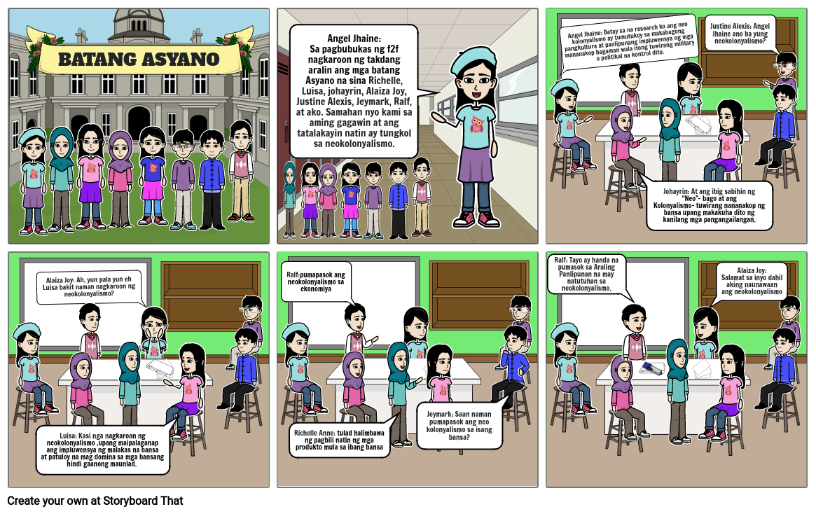 Angel Jhaine:Sa pagbubukas ng f2f nagkaroon ng takdang aralin ang mga batang Asyano na sina Richelle, Luisa, johayrin, Alaiza Joy, Justine Alexis, Jeymark, Ralf, at ako. Samahan nyo kami sa aming gagawin at ang tatalakayin natin ay tungkol sa neokolonyalismo.