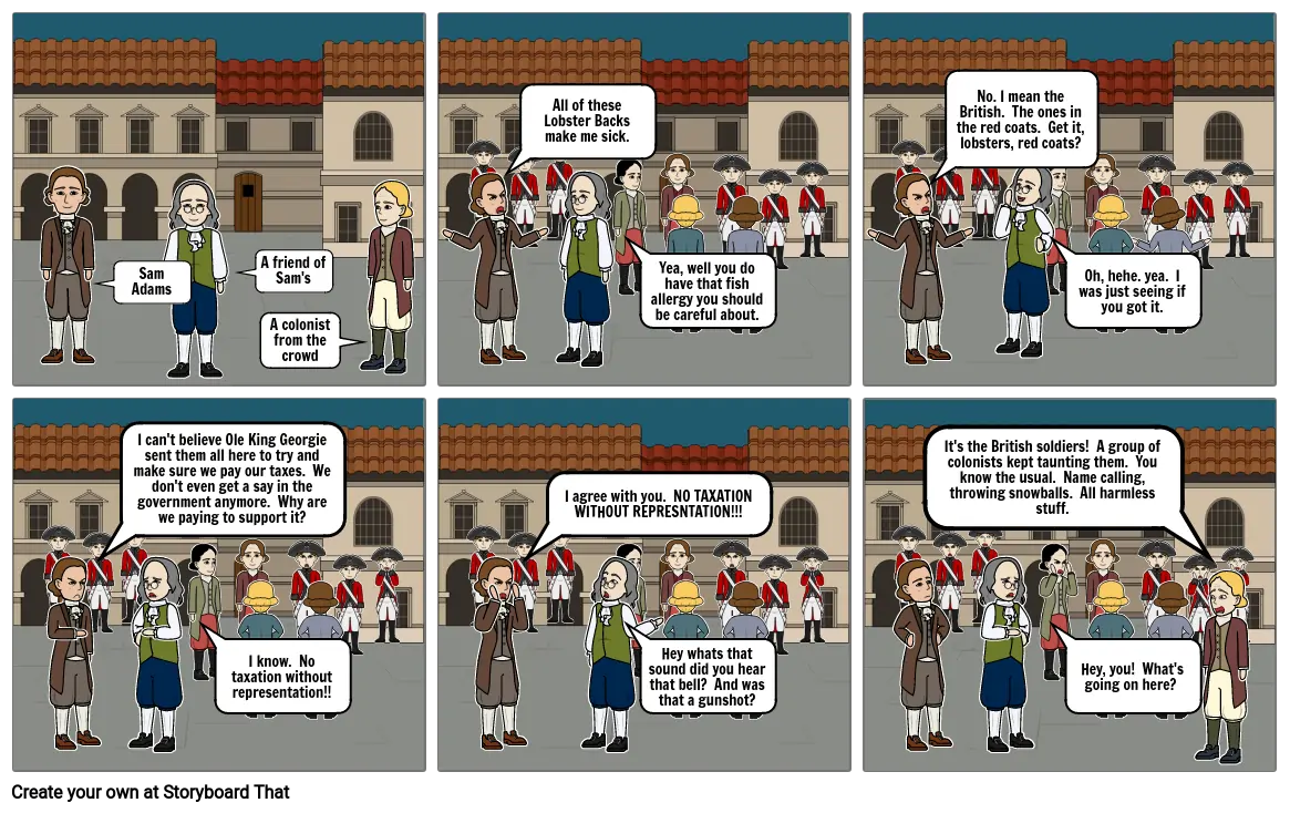 It's the British soldiers! A group of colonists kept taunting them. You know the usual. Name calling, throwing snowballs. All harmless stuff.