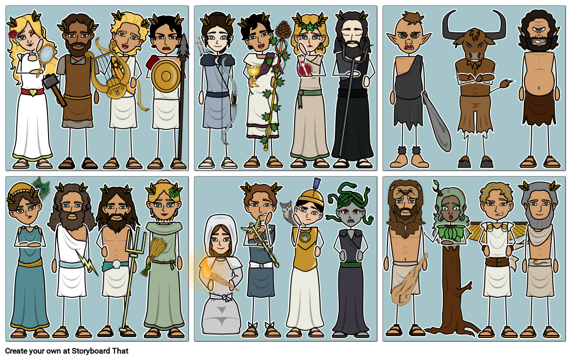 The twelve Olympians, Hestia, Hades, Medusa, Heracles, Icarus, Aeolus, Polyphemus, the Minotaur, Daphne, and a Laestrygonian!
