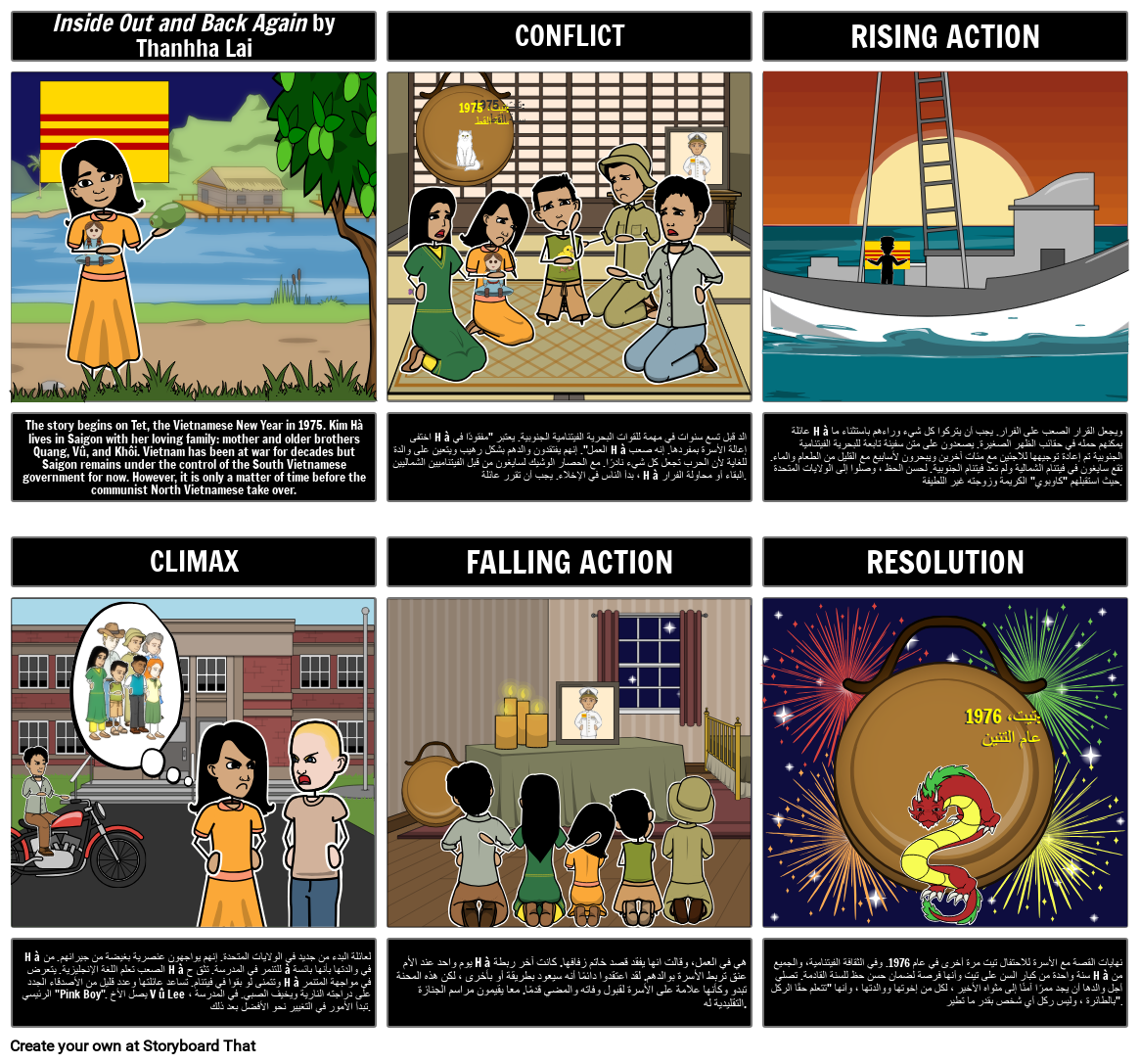 يمكن للطلاب تلخيص وتوضيح حبكة القصة في لوحة القصة المكونة من 6 خلايا والتي تسلط الضوء على العرض والصراع ، والعمل المتصاعد ، والذروة / نقطة التحول ، والحركة المتساقطة ، والقرار.