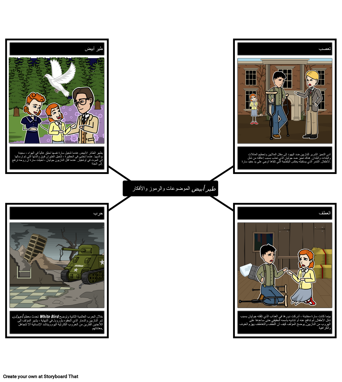 هناك العديد من الموضوعات الموجودة في جميع أنحاء رواية White Bird بما في ذلك الموضوع الواضح للهولوكوست: الأسرة ، والصداقة ، والتحيز ، والشجاعة ، واللطف ، والائتلاف وأكثر. يمكن للطلاب استكشاف موضوع في رواية عن طريق تحديد موضوع وإنشاء صورة وتعليق يصور مثالاً له من النص.
