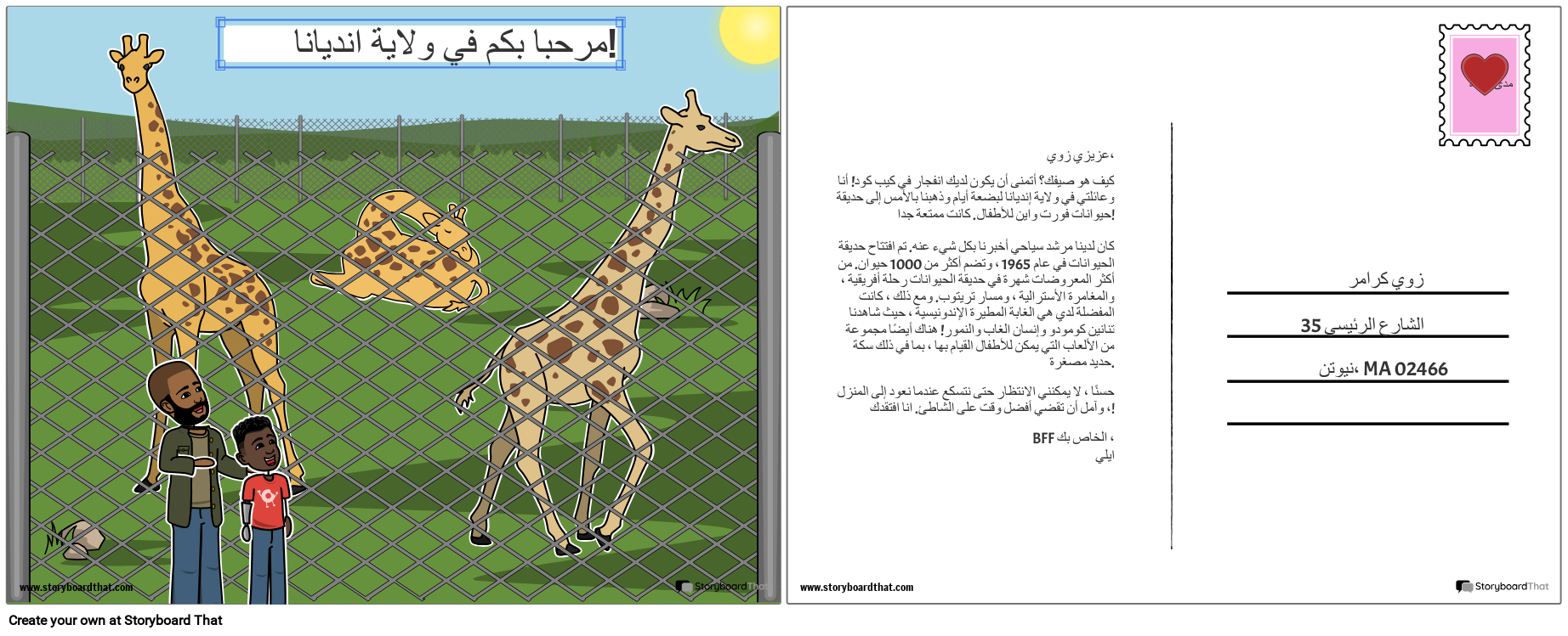 عزيزي زوي، كيف هو صيفك؟ أتمنى أن يكون لديك انفجار في كيب كود! أنا وعائلتي في ولاية إنديانا لبضعة أيام وذهبنا بالأمس إلى حديقة حيوانات فورت واين للأطفال. كانت ممتعة جدا! كان لدينا مرشد سياحي أخبرنا بكل شيء عنه. تم افتتاح حديقة الحيوانات في عام 1965 ، وتضم أكثر من 1000 حيوان. من أكثر المعروضات شهرة في حديقة الحيوانات رحلة أفريقية ، والمغامرة الأسترالية ، ومسار تريتوب. ومع ذلك ، كانت المفضلة لدي هي الغابة المطيرة الإندونيسية ، حيث شاهدنا تنانين كومودو وإنسان الغاب والنمور! هناك أيضًا مجموعة من الألعاب التي يمكن للأطفال القيام بها ، بما في ذلك سكة حديد مصغرة. حسنًا ، لا يمكنني الانتظار حتى نتسكع عندما نعود إلى المنزل ، وآمل أن تقضي أفضل وقت على الشاطئ. انا افتقدك! BFF الخاص بك ، ايلي