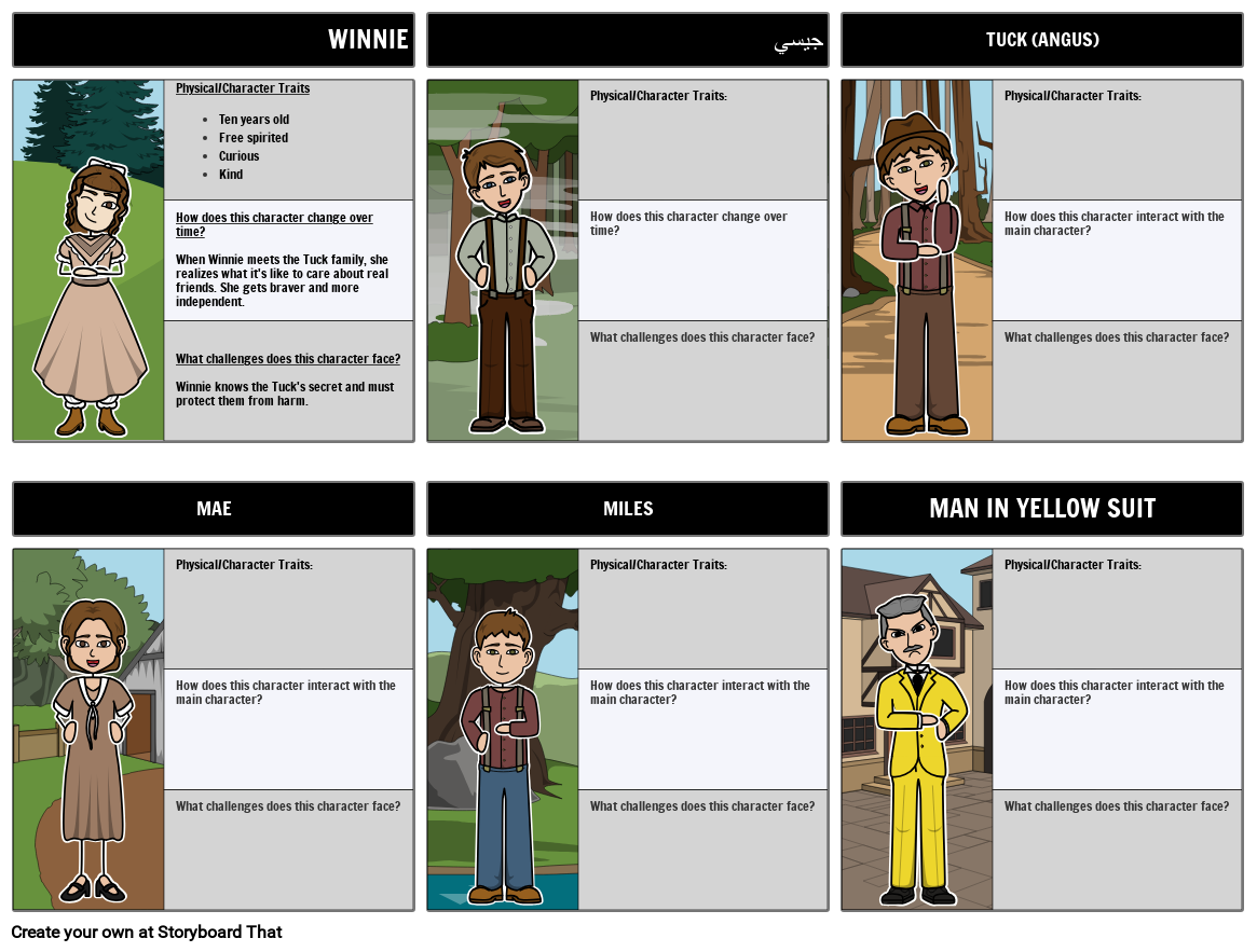 قم بإنشاء خريطة شخصية لتتبع الشخصيات في Tuck Everlasting بواسطة Natalie Babbitt وكيف تتغير خلال القصة!