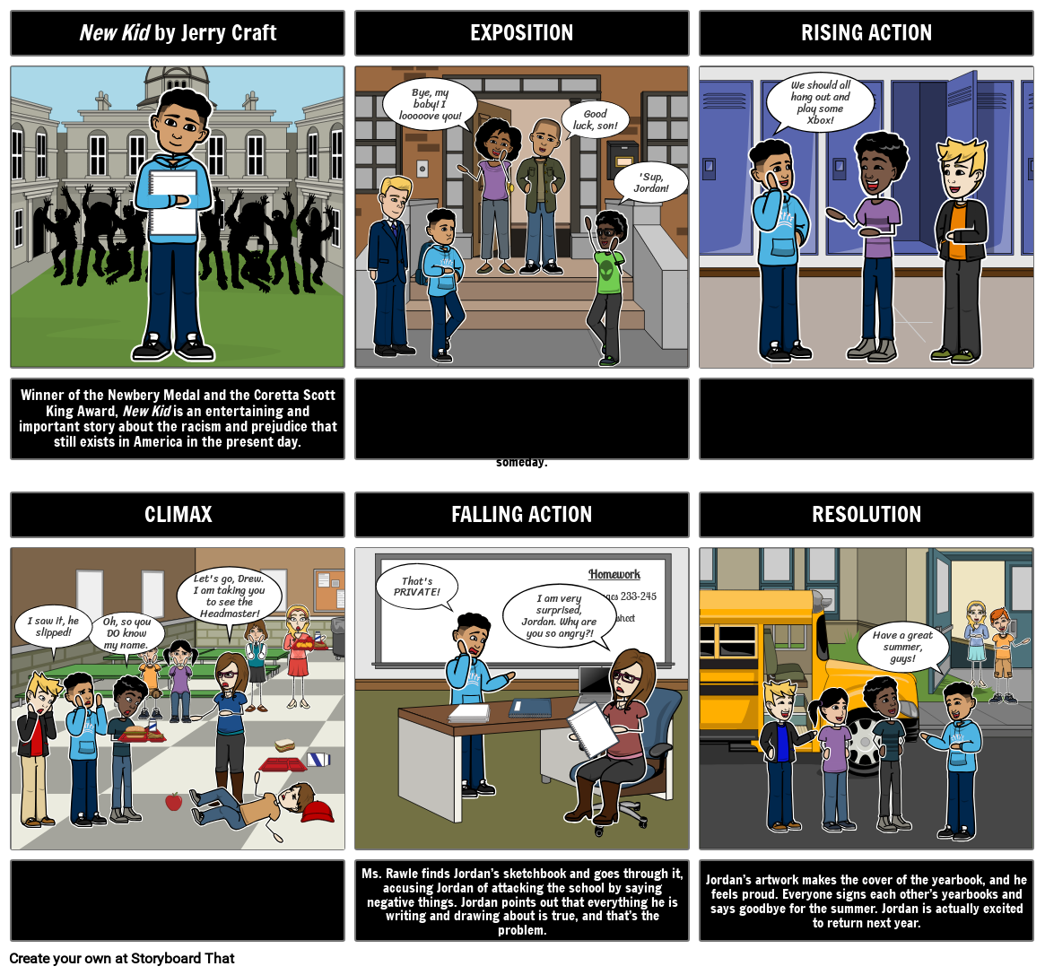 اطلب من الطلاب إنشاء رسم تخطيطي مرئي لـ New Kid بواسطة Jerry Craft ، مع إبراز المشاهد أو الأحداث الرئيسية من القصة.