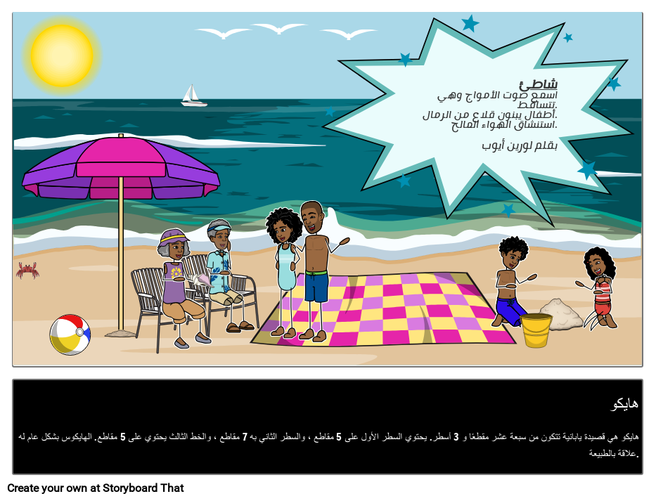 شاطئ اسمع صوت الأمواج وهي تتساقط. أطفال يبنون قلاع من الرمال. استنشاق الهواء المالح. بقلم لورين أيوب