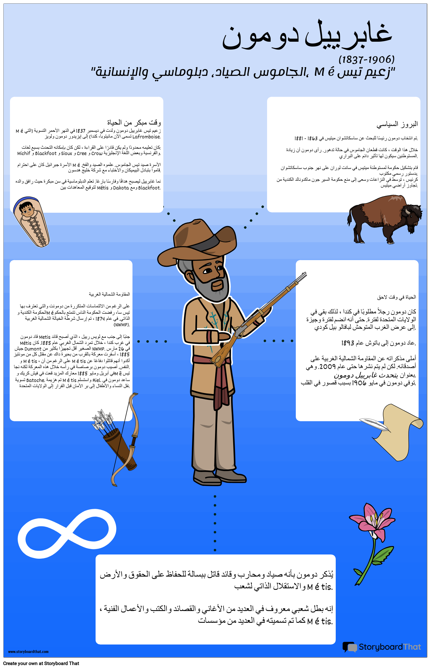 متيس كندا هم سياسيون وفنانون ونشطاء وكتاب مشهورون وأكثر! يمكن للطلاب البحث عن شخص من تراث Metis وإنشاء ملصق للسيرة الذاتية يسلط الضوء على إنجازاتهم. يدور هذا الملصق حول المناضل الشهير من أجل الحرية Metis ، غابرييل دومون!