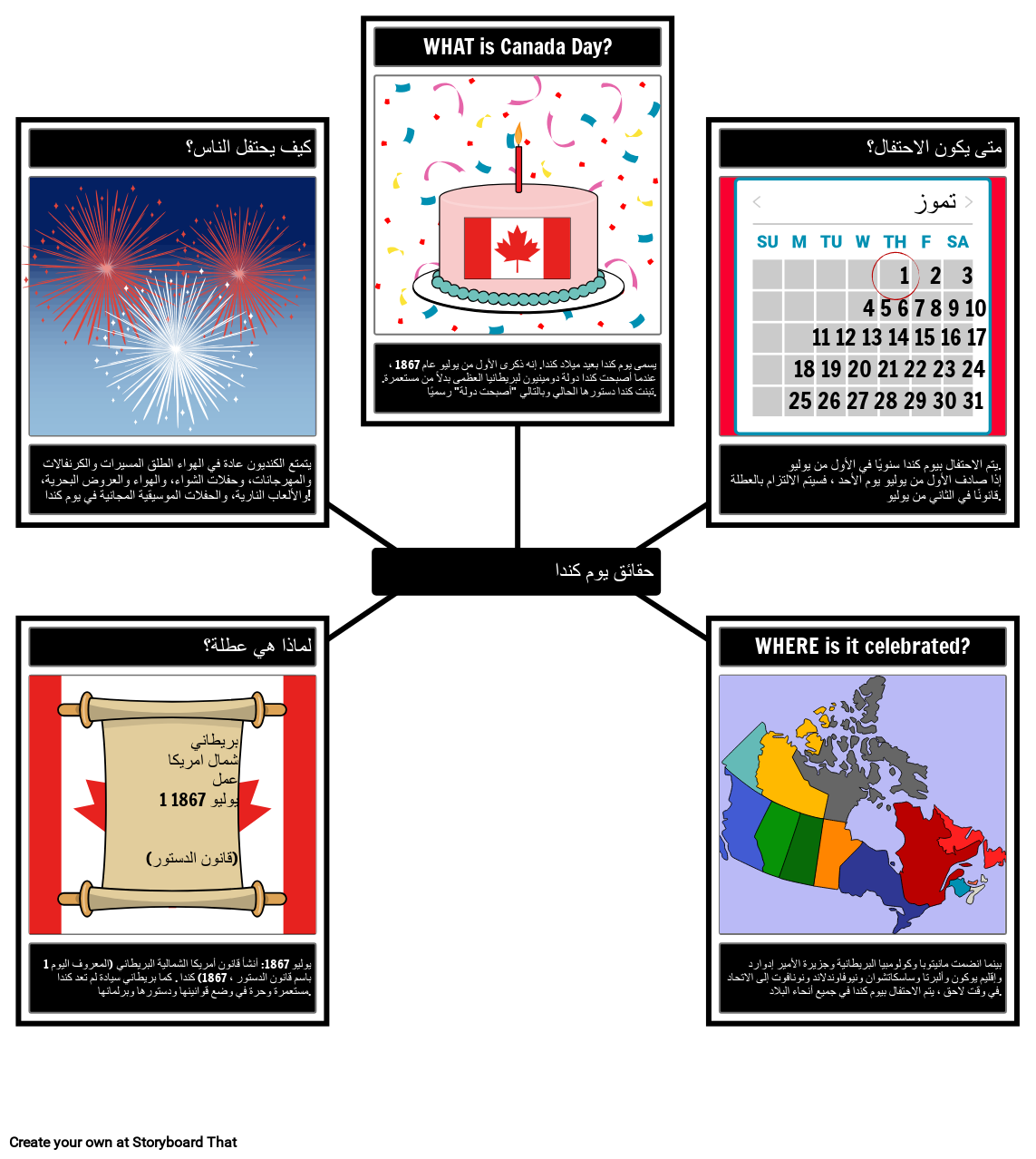 يشار إلى يوم كندا أحيانًا باسم عيد ميلاد كندا ولكنه أكثر تعقيدًا من ذلك بقليل! يمكن للطلاب إنشاء خريطة عنكبوتية لشرح الحقائق الرئيسية للإجابة على أسئلة يوم كندا مثل: ما هو يوم كندا؟ متى هو؟ أين هو احتفلت؟ لماذا أصبحت عطلة؟ كيف يحتفل الناس؟