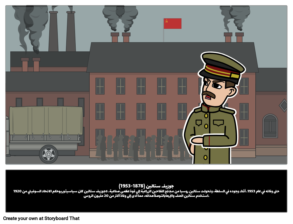 جوزيف ستالين (1878-1953)جوزيف ستالين كان سياسيثوريوحكم الاتحاد السوفيتي من 1920s حتى وفاته في عام 1953. أثناء وجوده في السلطة، وتحولت ستالين روسيا من مجتمع الفلاحين الزراعية إلى قوة عظمى صناعية. استخدم ستالين العنف والإرهابالتوصلأهدافه، مما أدى إلى وفاة أكثر من 20 مليون الروس.