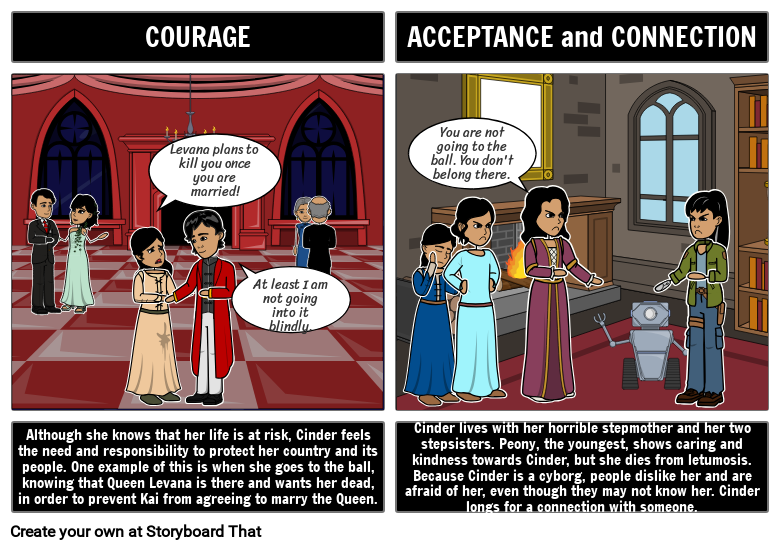 Cinder lives with her horrible stepmother and her two stepsisters. Peony, the youngest, shows caring and kindness towards Cinder, but she dies from letumosis. Because Cinder is a cyborg, people dislike her and are afraid of her, even though they may not know her. Cinder longs for a connection with someone.