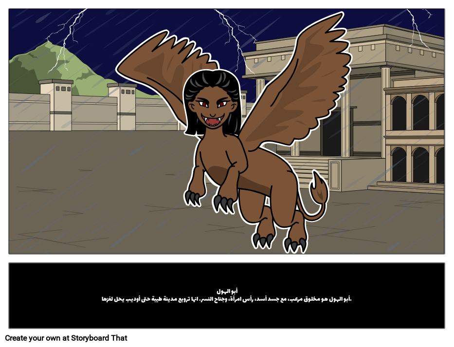 أبو الهولأبو الهول هو مخلوق مرعب، مع جسد أسد، رأس امرأة، وجناح النسر. انها ترويع مدينة طيبة حتى أوديب يحل لغزها.