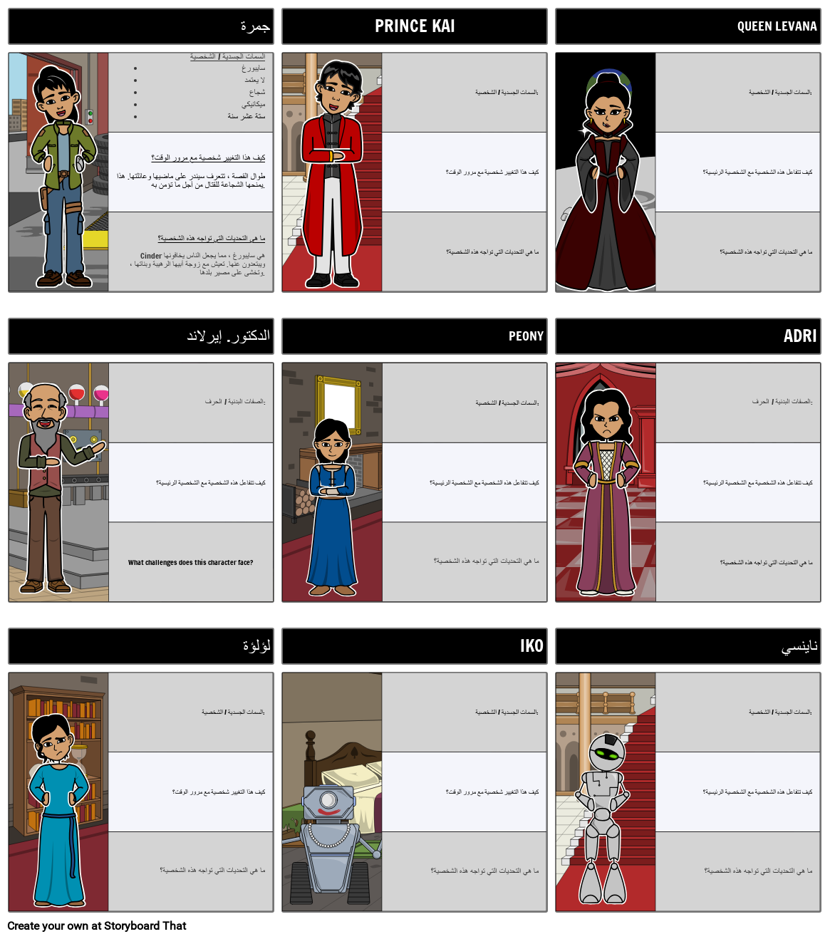 السمات الجسدية / الشخصية سايبورغ لا يعتمد شجاع ميكانيكي ستة عشر سنة كيف هذا التغيير شخصية مع مرور الوقت؟ طوال القصة ، تتعرف سيندر على ماضيها وعائلتها. هذا يمنحها الشجاعة للقتال من أجل ما تؤمن به. ما هي التحديات التي تواجه هذه الشخصية؟ Cinder هي سايبورغ ، مما يجعل الناس يخافونها ويبتعدون عنها. تعيش مع زوجة أبيها الرهيبة وبناتها ، وتخشى على مصير بلدها.