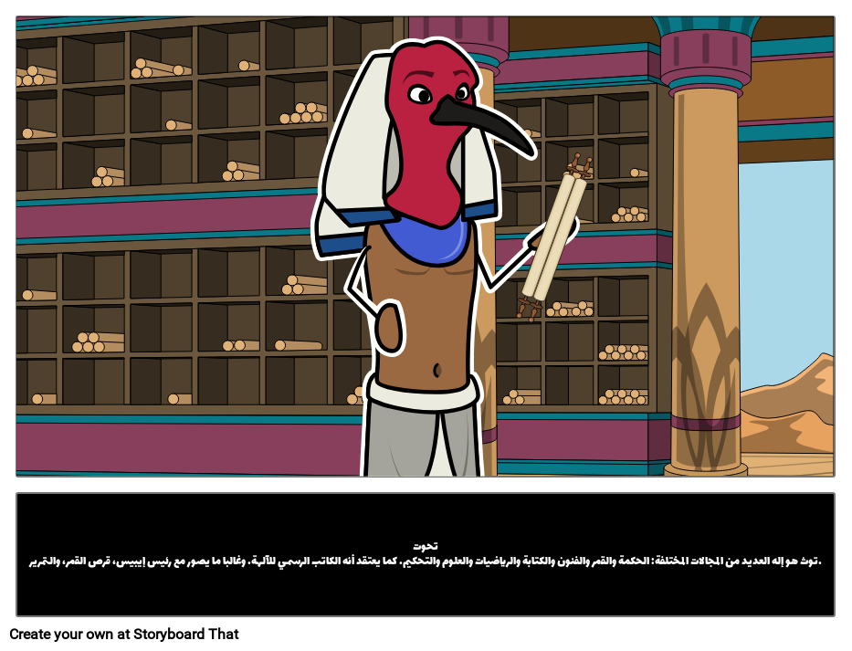 تحوتتوث هو إله العديد من المجالات المختلفة: الحكمة والقمر والفنون والكتابة والرياضيات والعلوم والتحكيم. كما يعتقد أنه الكاتب الرسمي للآلهة. وغالبا ما يصور مع رئيس إيبيس، قرص القمر، والتمرير.