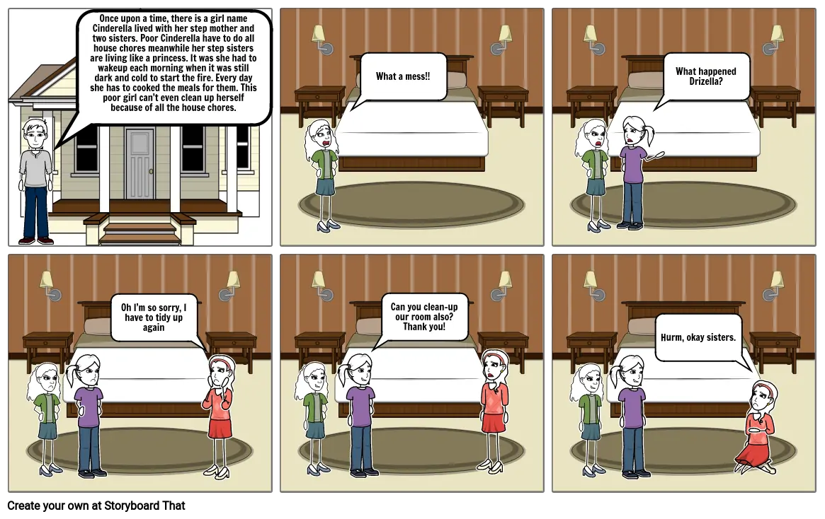 Once upon a time, there is a girl name Cinderella lived with her step mother and two sisters. Poor Cinderella have to do all house chores meanwhile her step sisters are living like a princess. It was she had to wakeup each morning when it was still dark and cold to start the fire. Every day she has to cooked the meals for them. This poor girl can’t even clean up herself because of all the house chores.