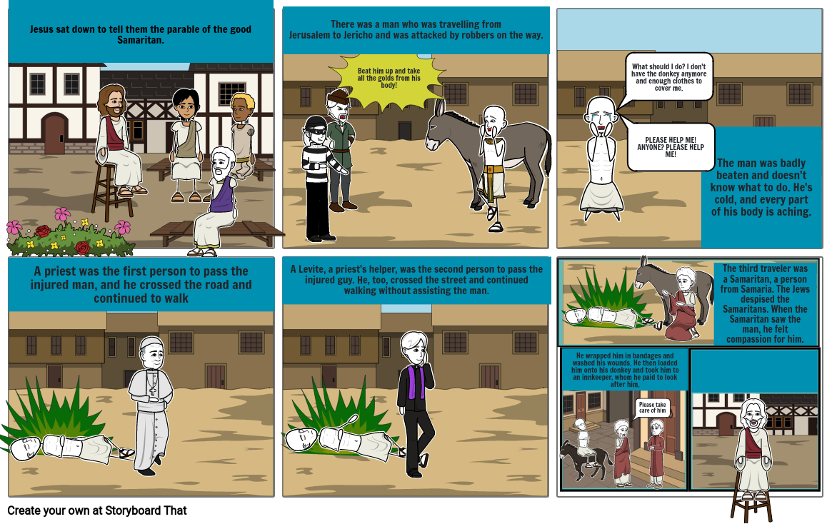 The third traveler was a Samaritan, a person from Samaria. The Jews despised the Samaritans. When the Samaritan saw the man, he felt compassion for him.