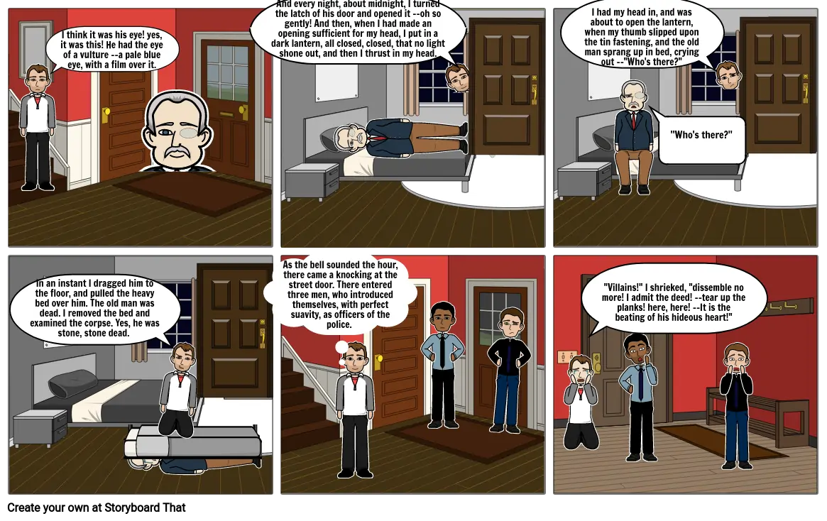 In an instant I dragged him to the floor, and pulled the heavy bed over him. The old man was dead. I removed the bed and examined the corpse. Yes, he was stone, stone dead.