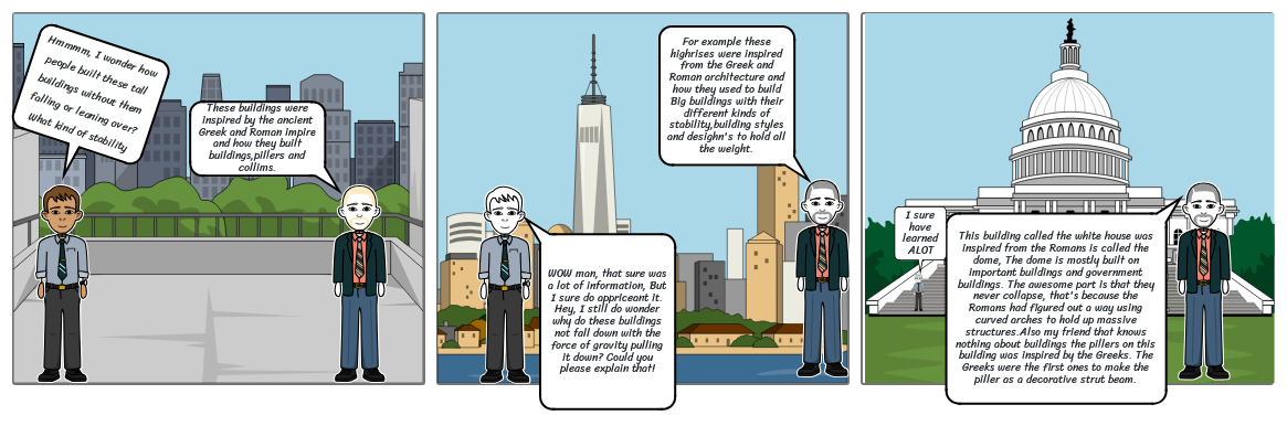 This building called the white house was inspired from the Romans is called the dome, The dome is mostly built on important buildings and government buildings. The awesome part is that they never collapse, that's because the Romans had figured out a way using curved arches to hold up massive structures.Also my friend that knows nothing about buildings the pillers on this building was inspired by the Greeks. The Greeks were the first ones to make the piller as a decorative strut beam.