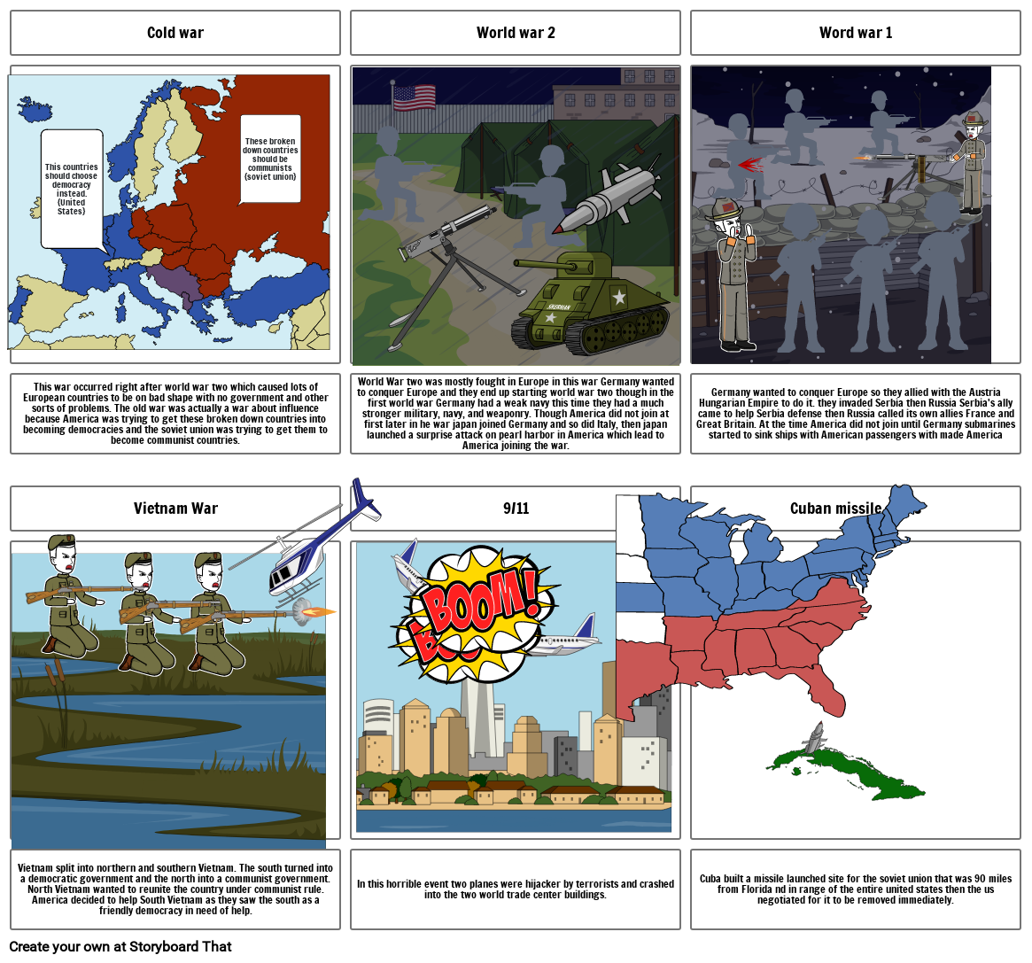 World War two was mostly fought in Europe in this war Germany wanted to conquer Europe and they end up starting world war two though in the first world war Germany had a weak navy this time they had a much stronger military, navy, and weaponry. Though America did not join at first later in he war japan joined Germany and so did Italy, then japan launched a surprise attack on pearl harbor in America which lead to America joining the war.