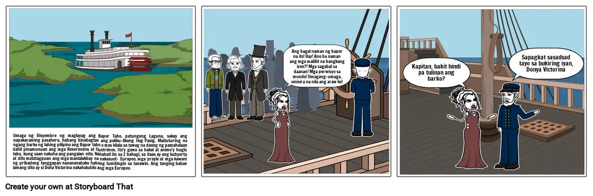 Umaga ng Disyembre ng maglayag ang Bapor Tabo, patungong Laguna, sakay ang napakaraming pasahero, habang binabagtas ang paliku-likong Ilog Pasig. Maituturing na ngang barko ng lahing pilipino ang Bapor tabo o mas kilala sa tawag na daong ng pamahalaan dahil pinamunuan ang mga Reverendos at Ilustrimos. Ito’y gawa sa bakal at animo’y hugis tabo, kung saan nakuha ang pangalan nito. Nahahati ito sa 2 bahagi, sa itaas ay ang kubyerta at dito matatagpuan ang mga manlalakbay na nakasuot- Europeo, mga prayle at mga kawani ng pribadong tanggapan nanananabako habang tumitingin sa tanawin. Ang tanging babae lamang dito ay si Doña Victorina nakahalubilo ang mga Europeo.